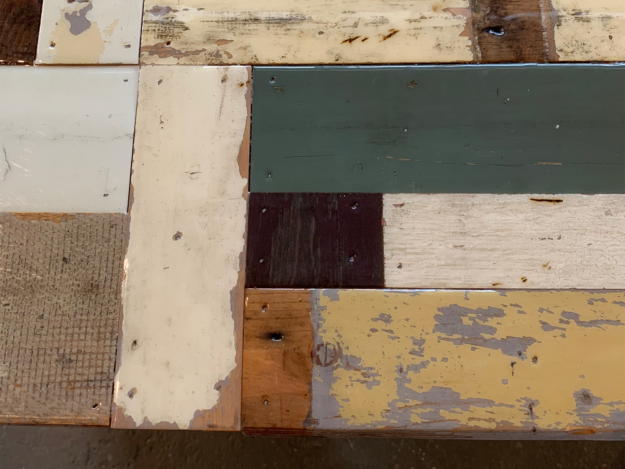 It brings to mind the products of Piet Hein Eek that reuse old timber floorboards from houses due for demolition. The splits, cracks and flaking paint are part of the aesthetic, giving each piece its own identity.